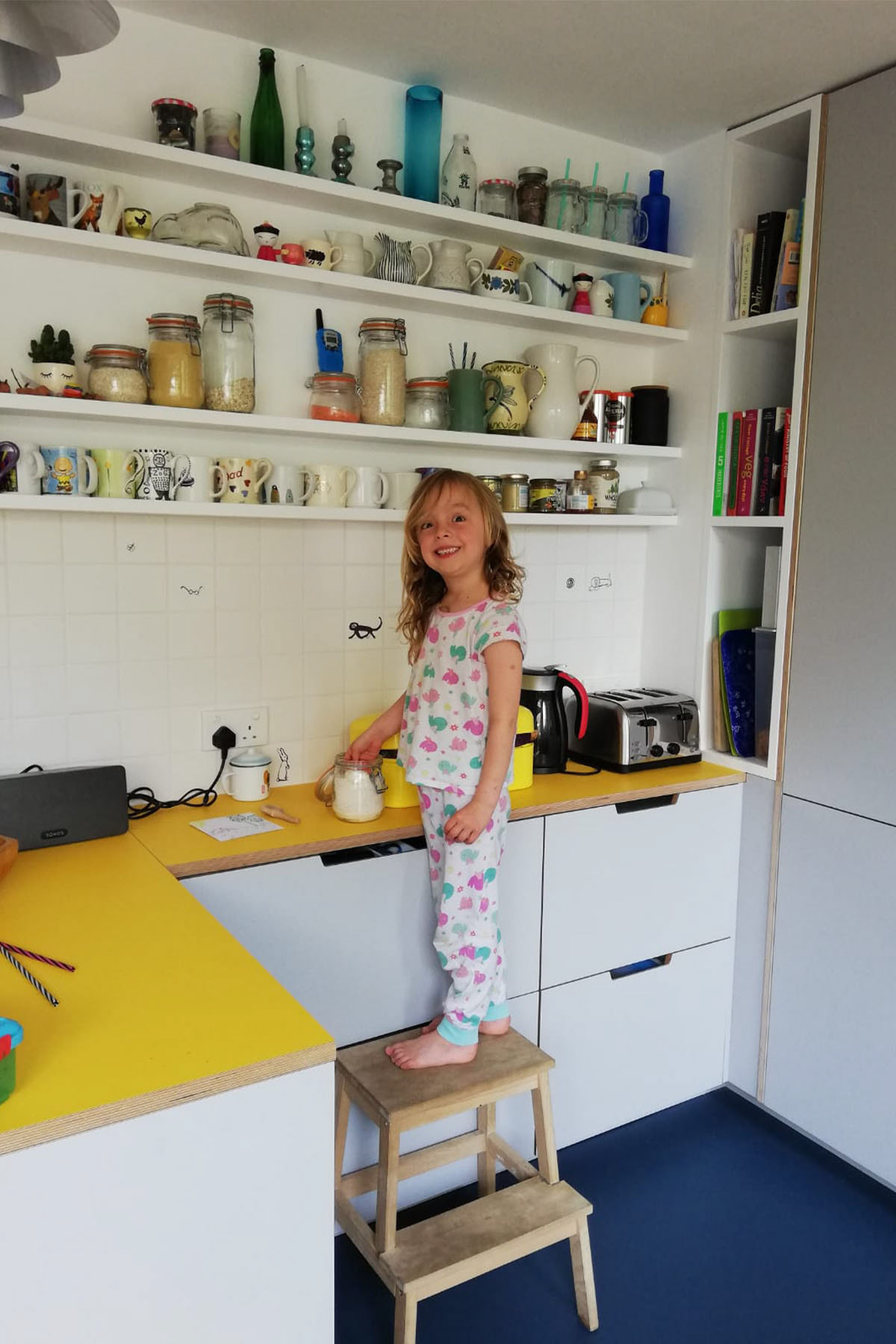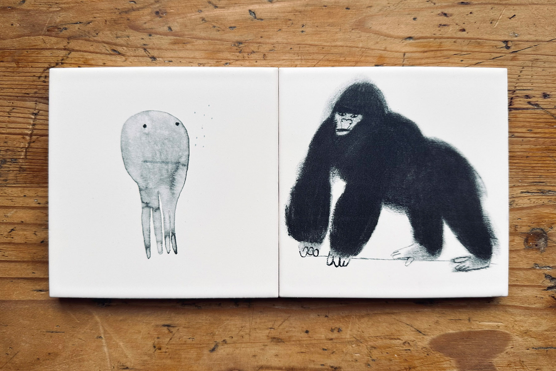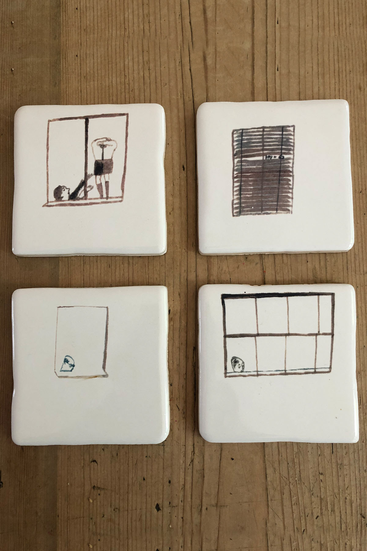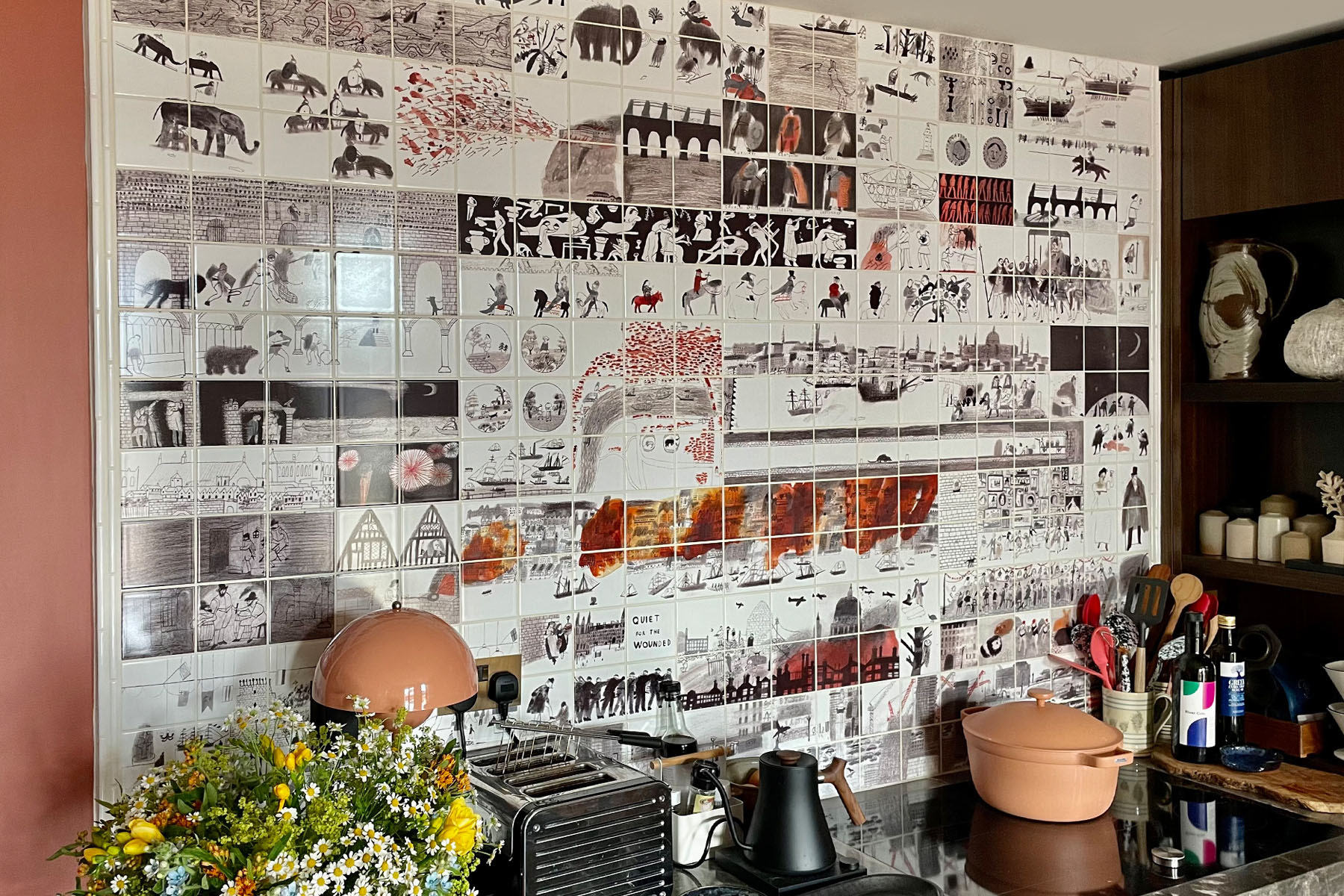 34 piece tile mural commission telling the owners' story of their house build in Frome, spanning single height horizontally throughout the kitchen space. We worked with the tile manufacturer to cut each tile to a bespoke size and chamfer all external corners negating the need for beading and keeping the flow of illustrations.