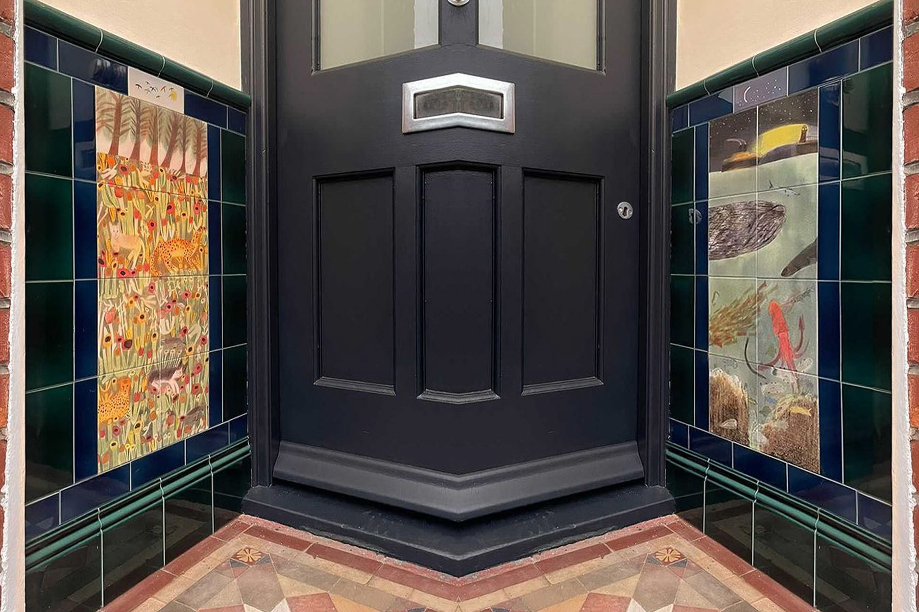 Private commission for a client's porchway, replacing the existing old tiles with completely new murals depicting day on one side and night on the other. The illustrations sit within a glazed colourway of mixed size flat field and traditional border tiles chosen to frame the scenes