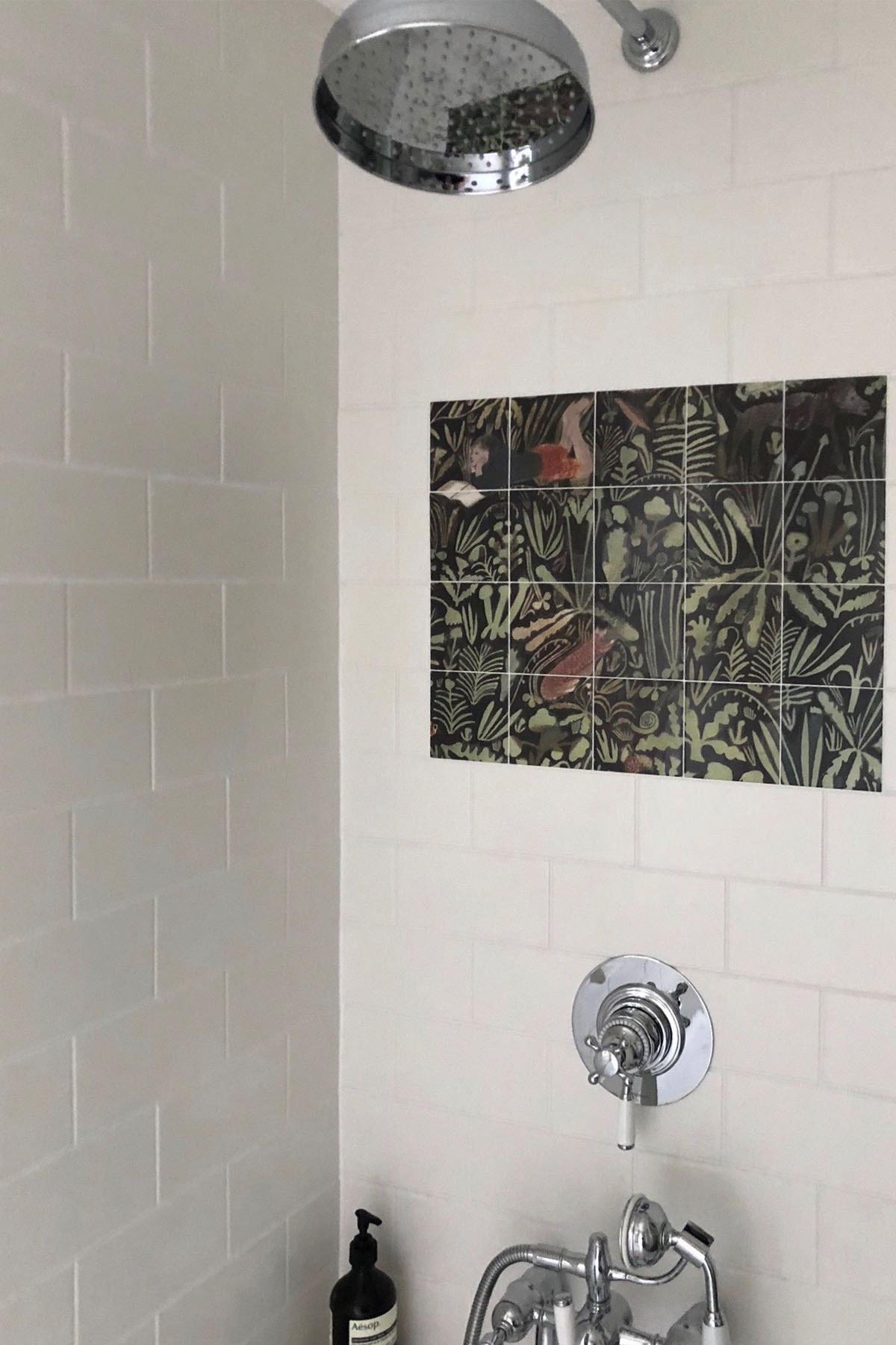 Residential bathroom design featuring 35 bespoke tiled illustrations playing on the culture and folklore of Japan (Photography courtesy of Paul Tucker)
