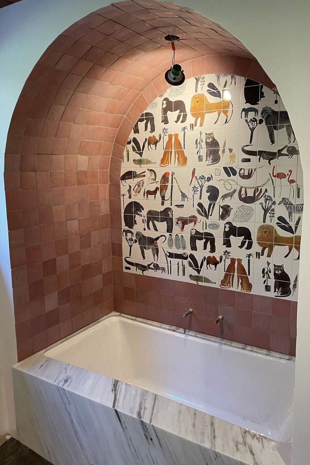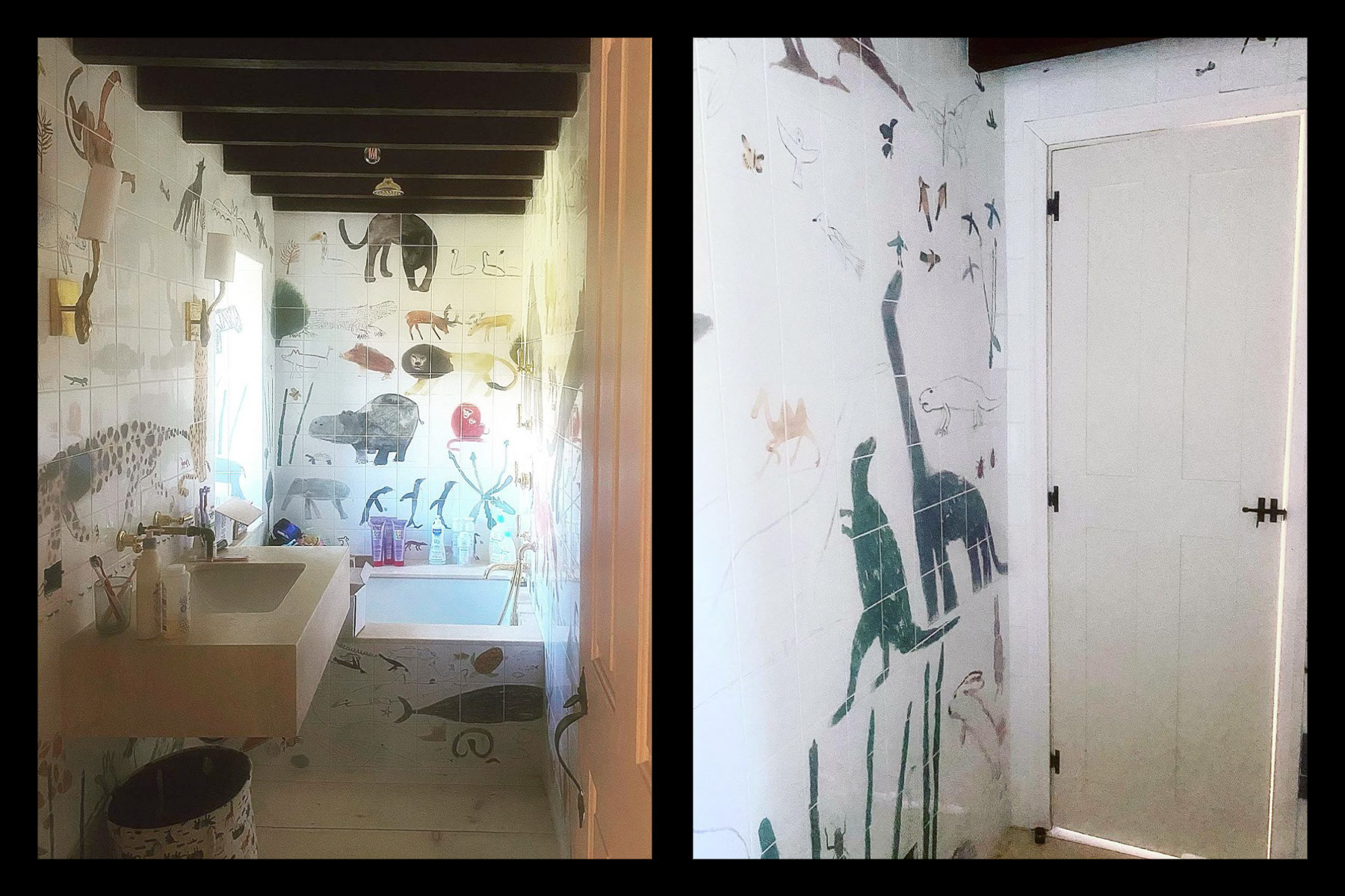 Bespoke mural commission for a child's bathroom featuring all of their favourite creatures from sea, land and air. Tiles wrap around every surface from floor to ceiling, bath panels and into window recesses. Hunterdon County, USA.